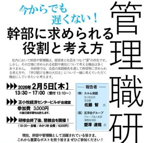 社内において幹部や管理職は、経営者と社員をつなぐ“要”の存在です。しかし、その立場に求められる役割や責任について考える機会は多くありません。本研修では、会員の実践報告を通して幹部等に求められる考え方や、「学び続ける事の […]