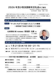 2026年苫小牧支部新年交礼会テーマ: “やっかいもの”から始まったエゾシカ事業~経営指針で加速する地域ビジネス創造~報告者:北泉開発(株)代表取締役 曽我部 元親 氏 会員が元気な顔を揃えて新しい年の飛躍を誓いあう、恒 […]