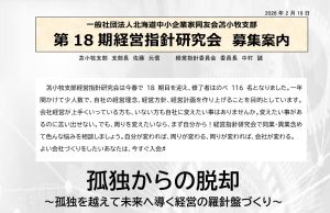 第18期経営指針研究会募集案内テーマ: 孤独からの脱却 ~孤独を越えて未来へ導く経営の羅針盤づくり~苫小牧支部経営指針研究会は今春で18期目を迎え、修了者はのべ116名となりました。一年間かけて少人数で、自社の経営理念、 […]